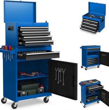 2-in-1 Chest with Detachable Toolbox. The tool chest features 5 drawers, two trays. And the whole storage cabinet can be detached into a box and a rolling tool chest, which can be used separately or together according to your requirement. When not in use, the toolbox can be stored in lower chest for saving space.